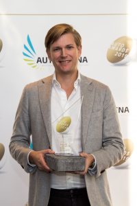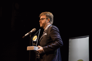 Årets Hållbarhetspris gick till Holmgrens Bil och togs emot av Thibaud Hartwig Holmgren.