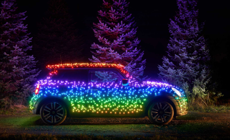 En eldriven Mini har prytts med 2 000 ledlampor som en del i en fem veckor lång välgörenhetstur genom Storbritannien, där bilen skall sprida helgstämning och samtidigt samla in pengar till olika organisationer.