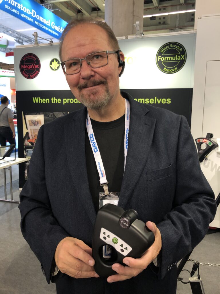Vi har också besökt Autoglass från Örebro, som har uppfunnit en ny batteridriven UV-lampa för glaslagningar. Ägaren Håkan Rönnholm berättar att lampan, vars batteri räcker till 250 reparationer på en laddning, härdar limmet på sex sekunder i stället för de sedvanliga 30 vilket sparar mycket tid i verkstaden.