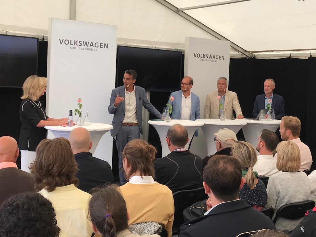 Självklart har självkörande bilar penetrerats i Almedalen. Av den här kvartetten, bland annat under fullsatt tältduk i VW groups trädgård. Vi fångade några uttalanden och en bild på moderatorn Helena Stålnert och panelen med Petter Djerf, Claes Jerveland, Jonas Bjelfvenstam och Jan Hellåker.