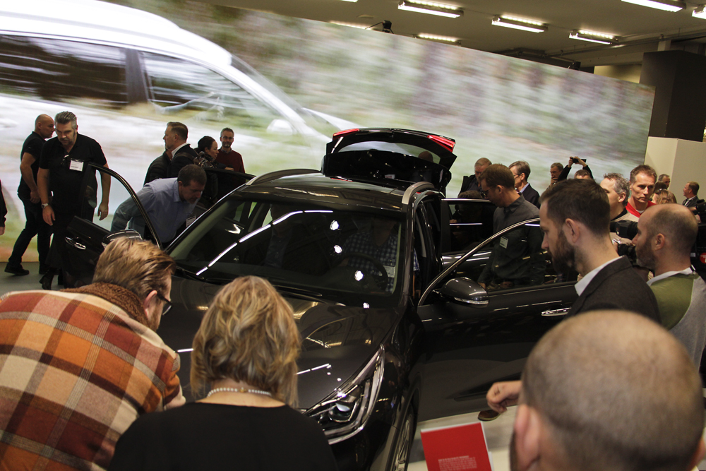 I Kias monter har ett hundratal personer samlats för att se när det premiärröda skynket från nya modellen Niro EV åker av.
