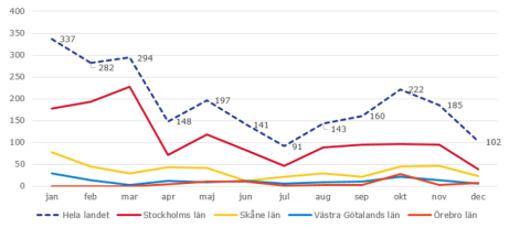 Larmtjänst har kommit med statistik från 2018 som visar att bildelsstölderna minskade med 45 procent jämfört med året innan.I fjol skedde 2 302 stöldtillfällen av bildelar. Skadekostnaderna uppgick till närmare 163 miljoner kronor, en minskning med 35 procent. Diagrammet ovan visar antalet stöldtillfällen fördelat över tid och de fyra mest drabbade länen.
