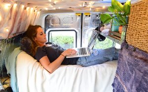 Hon bor extremt kompakt i en Ford Transit Connect som har ett skrivbord där hon jobbar med bland annat webbdesign, och på kvällen fäller hon ut en säng. Solpaneler ger henne tillräckligt med el för att driva ett kylskåp, belysning och hennes elektronikprylar.