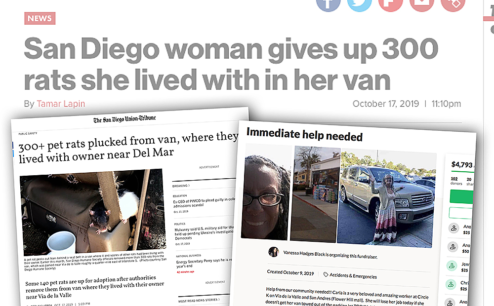 En kvinna som bodde i sin skåpbil i Kalifornien tvingades be myndigheterna om hjälp. De två råttor hon hade som husdjur hade förökat sig till fler än 300 och åt upp både elsladdar och säten.
