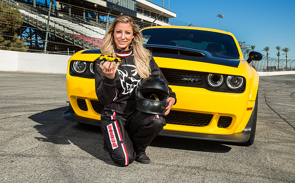 Nu finns två klassiska amerikanska superbilar i Lego-versioner. Den danska lekjätten har precis släppt Dodge Charger R/T 1970 och Dodge Challenger SRT Demon 2018. På bilden syns amerikanska racingmästaren Leah Pritchett med två Dodge Challenger SRT Demon 2018.