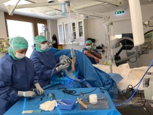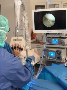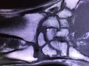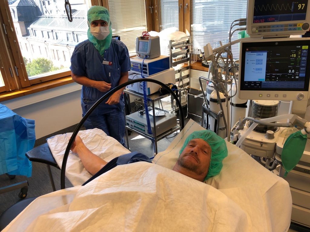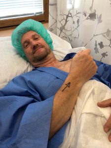 Här opereras MRF:s Joachim Due-Boje i höger handled för en arbetsskada. 30 års mekande med långvarig användning av vinkelsnurror och bankande på lednycklar och dylikt mot bultar tog ut sin rätt på en led. Nu har ortopeden slipat ner skelettytorna där brosk saknades för att lindra värken.