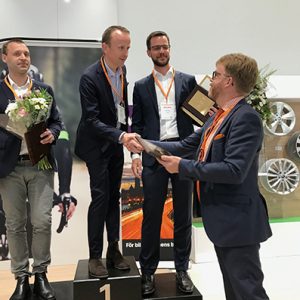 Topptrion på personbilssidan tar emot diplom av MRF:s vd Tommy Letzén. Från vänster: John Hurtig, Subaru, Kristian Alverfors, Volvo Car och Gustav Freij, Isuzu.