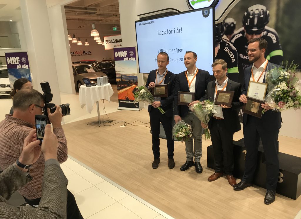 Topptrion på personbilssidan tar emot diplom av MRF:s vd Tommy Letzén. Från vänster: John Hurtig, Subaru, Kristian Alverfors, Volvo Car och Gustav Freij, Isuzu.