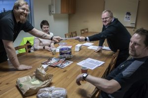 Fredrik Olehag som insjuknade i covid-19 är nu  tilllbaka på sin arbetsplats på Haag och Carlsson i Nyköping. Här tillsammans med sina arbetskamrater Linda Forsh, Jörgen Jonsson och Tommy Nordahl. Foto: Åke Ericson.