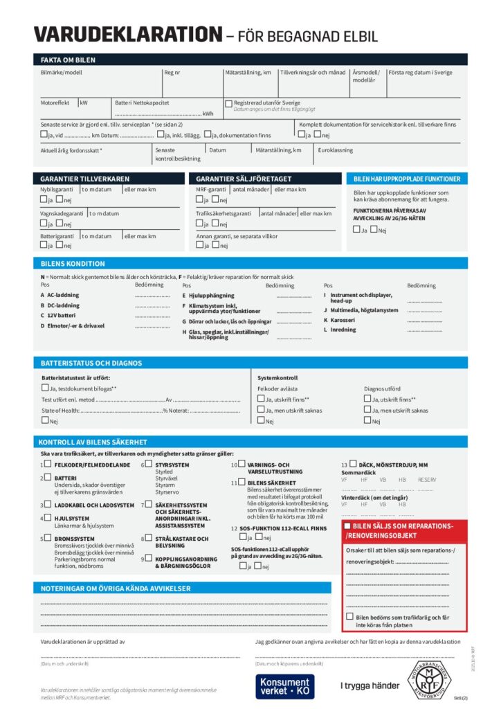 Den 1 november släpps två nya varudeklarationer, VDN, för bilhandlare, en helt ny för elbilar och en ny version för övriga bilar. Bakgrunden är att såväl bilar som lagstiftning utvecklas och handeln måste hänga med. I den nya varudeklarationen krävs till exempel dokumentation på att bilens felkoder är avlästa, och möjligheten att ange O som i osäker funktion är borttagen.
