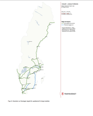 Fotnot: Trafikverket har identifierat 900 mil väg som kan upplåtas för längre fordon i ett första skede. Men alla de 900 milen består inte av sammanhängande sträckor. Trafikverkets förslag till vilket vägnät som är lämpligt att upplåta för längre lastbilar är därför de sträckor som bildar sammanhängande transportstråk och de omfattar totalt cirka 450 mil. Det är E4, E6, E18(Karlstad-Stockholm-Kapellskär) E16(Borlänge -Gävle) E20, E22, Väg 23, (Hässleholm-Växjö, Väg 25(Ljungby-Växjö), Väg 40(Göteborg-Jönköping-Nässjö), Väg 44(Trollhättan-Uddevalla) Väg 73, Väg 56 och Väg 70(Västerås-Sala – Borlänge) samt Väg 75 (södra länken). De flesta av dessa sträckor skulle kunna upplåtas inom ett år enligt Trafikverket. Undantagen är sträckorna väg 23(Hässleholm-Växjö) och E22(Karlskrona-Norrköping) som beräknas kunna öppnas för trafik år 2023 respektive år 2025.