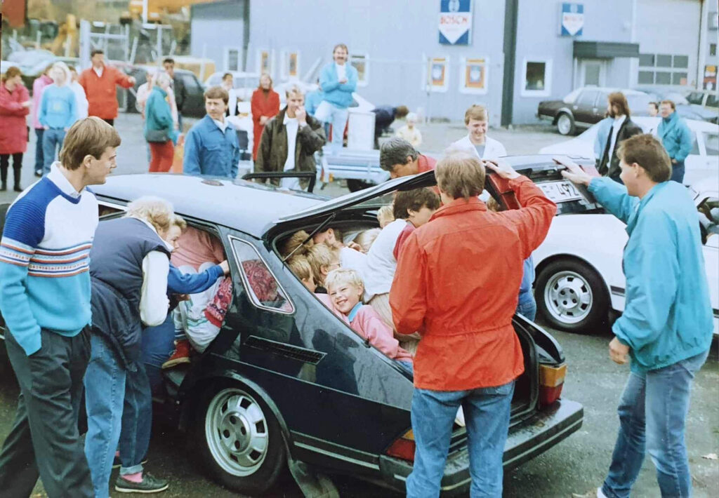 – Jag var reservdelschef på Saab-Ana i Stenungsund och vi hade ett enormt tryck med försäljningen och ohållbart långa väntetider i verkstaden. Då byggde vi ut verkstaden och startade tvåskift. När allt var klart att sjösättas skulle vi marknadsföra det och ordnade nyinvigning med många bra erbjudanden. Vi skapade bland annat en jubileumsbil, en vit Saab 9000 med egen dekorstripning och specialfälgar, jag tror den gjordes i fem exemplar. Sedan bjöd vi in två föreningar för att försöka sätta världsrekord i hur många barn man fick plats med i en Saab 900.