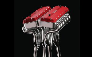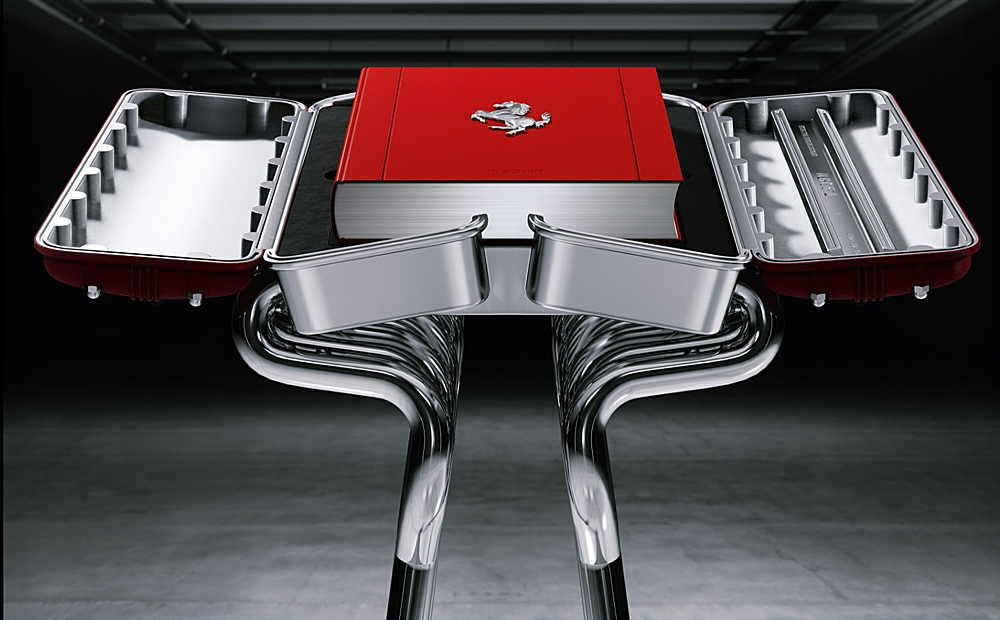 Det är som hämtat ur tv-serien ”Seinfeld” när Kramer gör en soffbordsbok som också fungerar som ett soffbord. Den nya boken ”Il Fascino Ferrari” leveras i en aluminium-kopia av en Ferrari V12-motor, som också fungerar som ett litet bord. När man öppnar topplocken visar sig den 514 sidor tjocka boken.