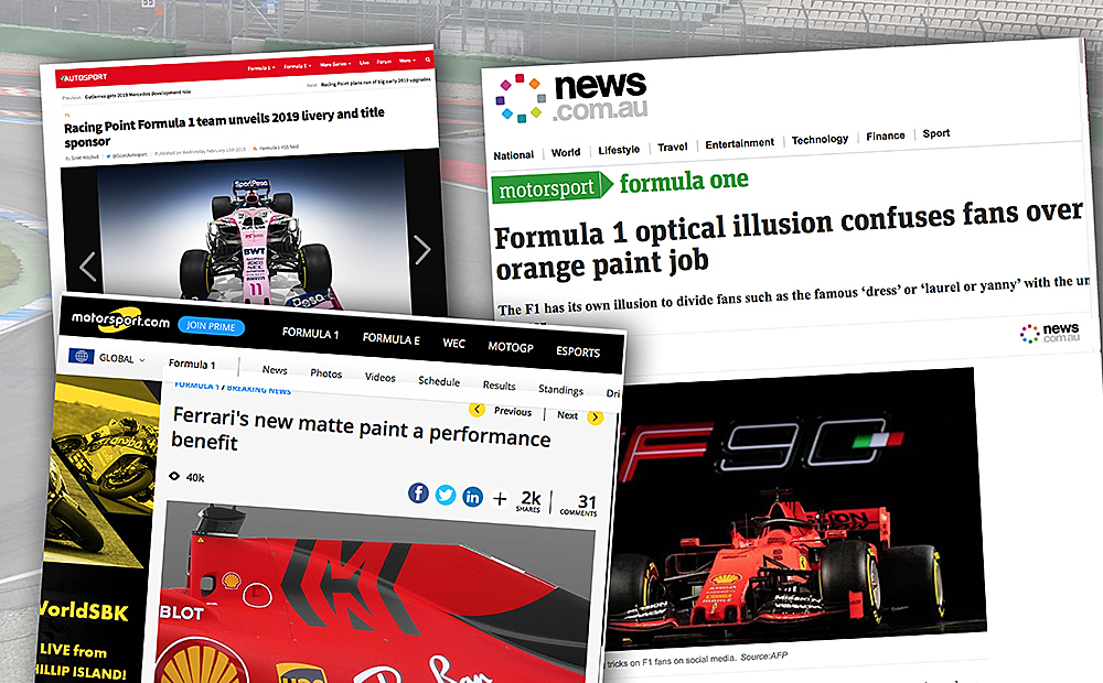 Inför årets säsong har också stallet Racing Point Force India bytt färg, från en metallic-rosa till en matt rosa. Det första stallet som satsade på den här nya trenden var Red Bull som bytte färg inför 2016-säsongen.