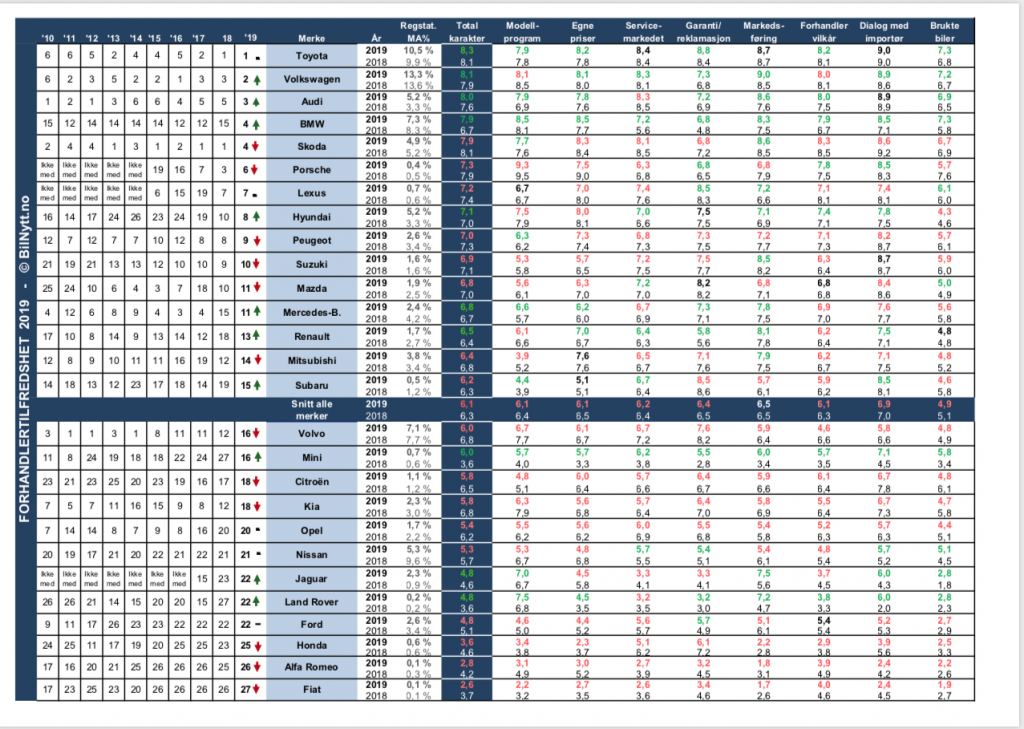 Resultaten från årets undersökning baseras på totalt 686 svar. Det är 25: e gången som BilNytt.no genomför nöjdhetsundersökningen, där vd:ar för märkeshandlarna säger vad de tycker om sin importör och deras varumärke inom flera viktiga områden.